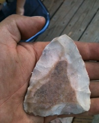 That's a good start seider.  Can't be afraid to turn it into gravel, though.  I like to make up several just a little furthur along than that one, then work them down a little more and put them aside and keep working them in progression.  If I come to a tough spot, I just put it down when I get frustrated and pick up another one.  Then come back to the frustration one later.  I've got a pile of pieces all @ different levels in the pit and in my knapping bag.  It's kinda tricky going from stage to the next, so I like to have a few going @ the same time.  keep on knappin, dpgratz