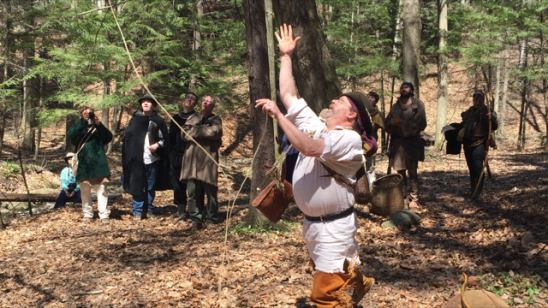 WOW! What a weekend. The weather turned out better than the forecast. We had 49 Adult shooters, a few kids and some folks who just stopped by to see what was happening. On Friday afternoon we held the first annual Boss Gobbler Shoot. The Boss Gobbler Shoot went several rounds and was finally won by Rob Marcotte with a incredible shot. Rob will now get to keep the Hawkeye Traveling Turkey Call and record his hunts in the log book before returning the call next year for another Hawkeye Member to win and hunt with. At Dusk on Friday, we held the one log primitive fire contest. Eric Schultz had his water boiling before all of the other Competitors and won a real nice knife that was donated by Joe Carbone. Unlike the traveling turkey call, Eric gets to keep the knife forever. A special prize of a take down buck saw made by Kevin was awarded to Colton. All of the leftover fires from each Competitor were added to a Memorial campfire for those who have passed. Later Friday Night, Dino (who is Nuisance Trapper" put on a skinning demo. A large crowd watched as he went over skinning and tanning hides. Early Saturday morning the Hawk and Knife throw was held. Tom and Pam have added some new twists and did a great job once again with it. Tom and Pam took the time to instruct some of the throwers who were new to it and even lent out their own hawk and knife. Brian Weiss won a real fine hawk for placing 1st place in the Hawk and Knife Event. The Hawk was also donated by Joe Carbone.  Next we had the Woodswalk which was run by Dino, Eric and Dino's son Colton. The scenario for this years Woodswalk was "Mountain Man Free Trappers in Bear Country". Those Boys put the Competitors through all sorts of scenarios including getting mauled by a bear and losing the use of your arm and dominate eye, making primitive cordage, throwing rabbit sticks, looking for various plants that were out of place on the course, navigating direction, building fires, identifying various animal skulls and of course shooting a bow! It was a hell of a lot of fun and was won by Kevin Raybould. Kevin won a handmade reed quiver that was made by Dino's Wife. Kevin already has a similar quiver so he gave it to the 2nd place finisher! Very generous Kevin. Thank You! Saturday evening the Camp Pot Luck Dinner was held and it was Fantastic! If you left there hungry it was your fault! Kevin donated a hand carved spoon as a prize to the best dish (which was voted on by all who attended). It turned out a tie between Kevin and Dino and Kevin awarded the spoon to Dino for his Shepards pie. Door prizes were given out and two sets of special Kids arrows were given out. The arrows were made by Gerry Lee.  After Dinner we took a group picture for a Get Well Card for our Friend Ed who is normally at the Spring Thaw Shoot. On Sunday morning the Clout Shoot was held. I do not have the Winners name as I missed that event. Thank you to all who attend. Thank you to all of the Hawkeye Members who helped out and Thank you to all who donated the prizes. Here are a few pictures. More to come as I get them organized. Special thanks goes out to John Wiehe for taking many of the photos.