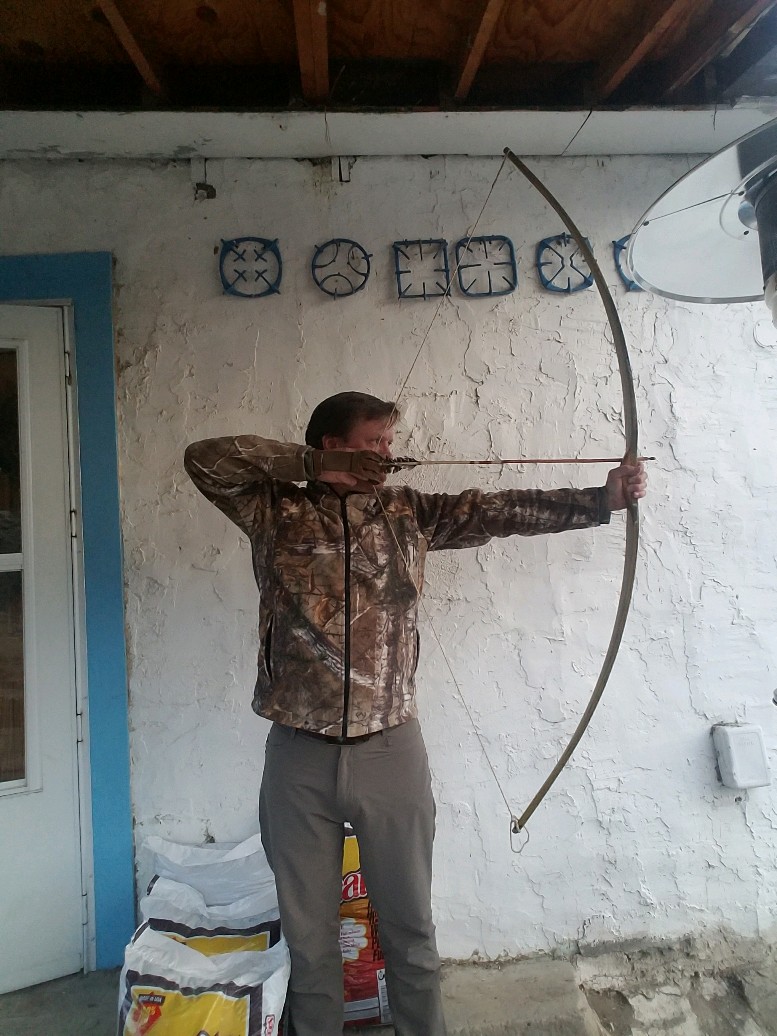 2 of my first 4 bows have survived and I thought I'd share pics of the 2nd to survive 100 arrows shot; the white oak board bow with Osage Orange handle.  For context I've acquired several rasps, draw knives, scrapers and built a shaving horse and bow vice. Jigsaw used to rip the 12' x 10"x2" white oak board (had been sitting in a covered lumber yard in western New mexico with 5 other such boards for 20-30 years according to the boss).  My first bow was a Chokecherry 3" sapling stave that I created a hinge in during tillering after a few beers and reading the quote from TBB vol.1 that says, "Don't waste time and wood."  It never broke but shoots 24lbs at 26". I backed that one with tanned deer hide.  Then I broke the best Chokecherry stave I could find in my local woods, unbacked with killer hinge.  Same thing happened with my 3rd bow which I was much more careful with; Vine maple stave D-27 from vinemaple.com.  So, I was feeling desperate for a shootable bow with more weight and so far this Pyramid white oak bow feels good.